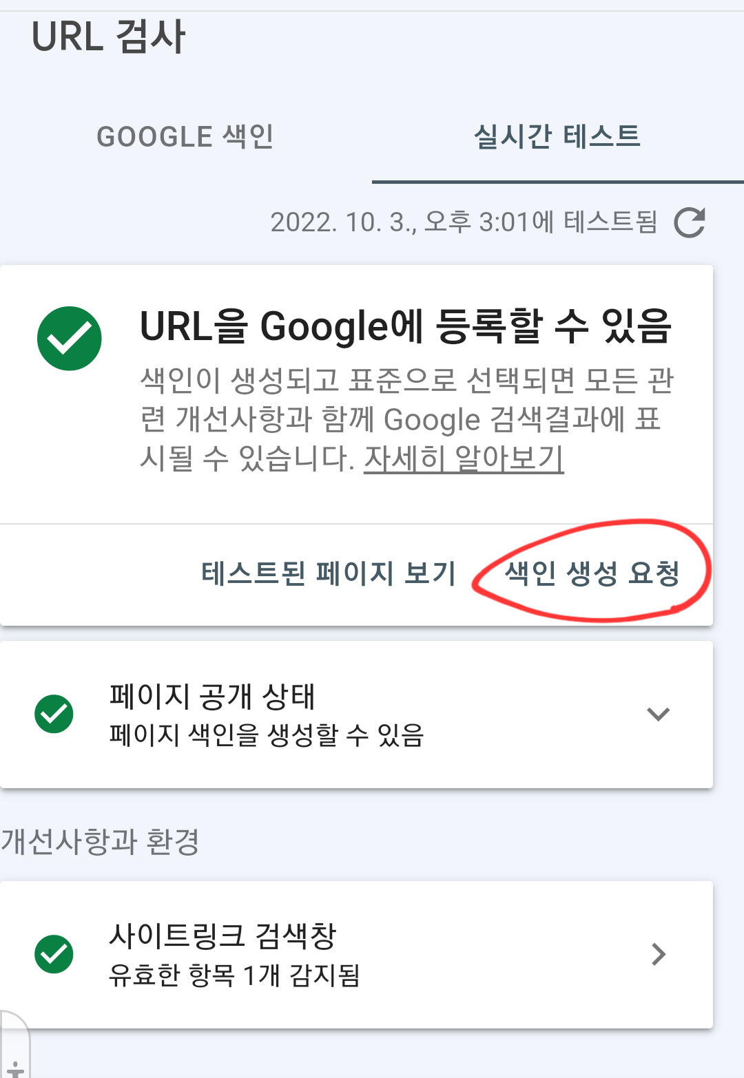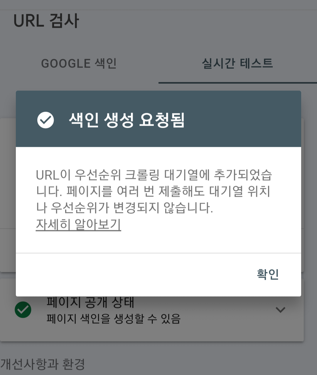 13. 아래와 같은 화면이 나오면 [색인 생성 요청]을 클릭해주세요.