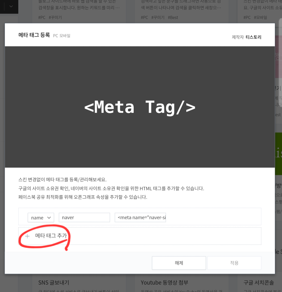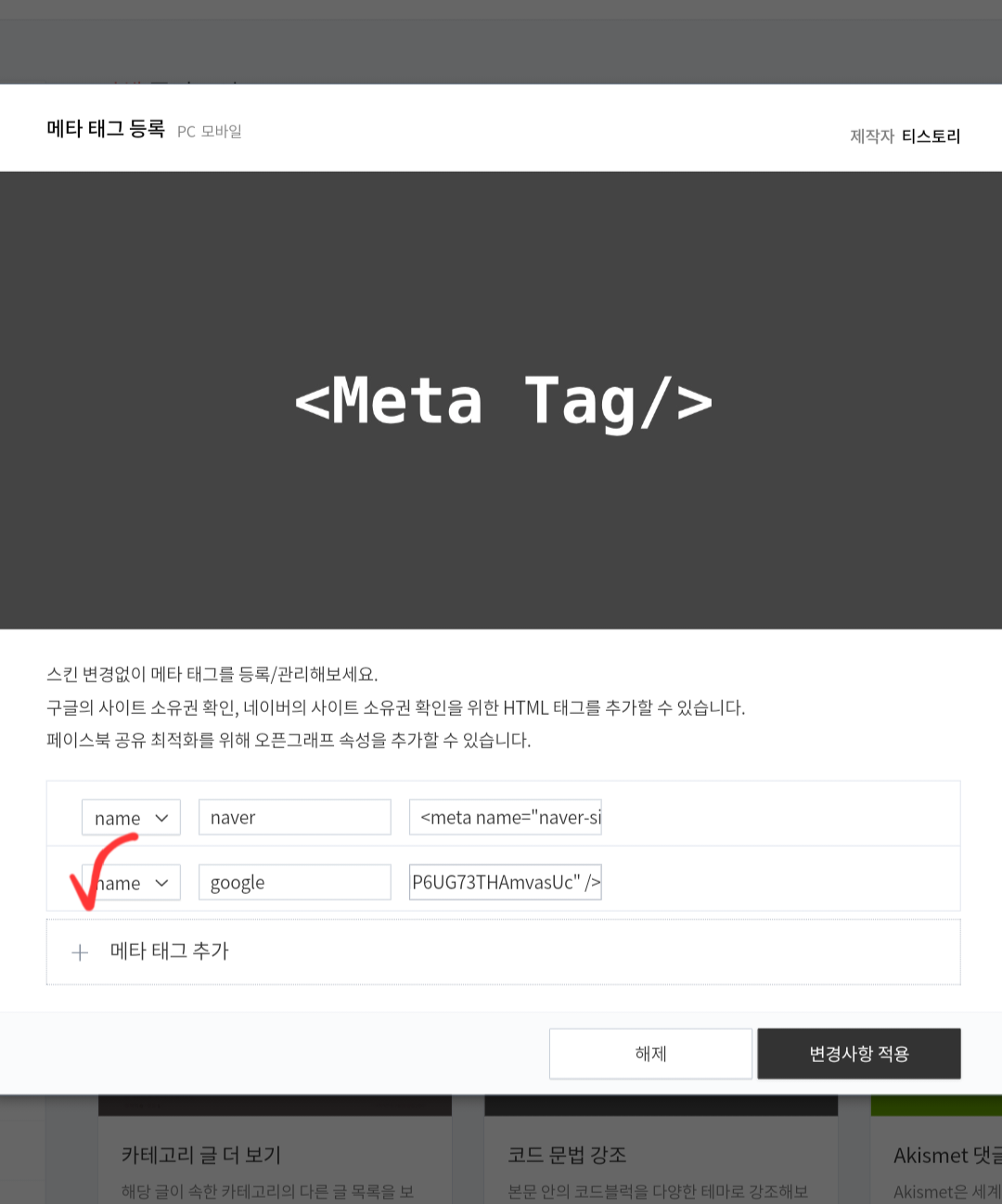 <Meta Tag/>를 선택해 하단의 [메타 태그 추가]를 클릭해주세요.